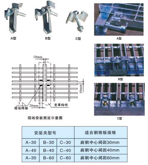 鋼格板的固定有焊接和安裝夾兩種方法。對永久性不需拆卸,可采用焊接,將其焊在支承物上。具體位置,在板的每個角第一根扁鋼上,焊縫長不小于20毫米,高不小于3毫米的角焊。采用安裝夾具有不破壞鋅層和拆卸方便的優點,每塊板至少應采用四個安裝夾,對較大的板塊最好在可利用的支承物上多安裝幾個。
